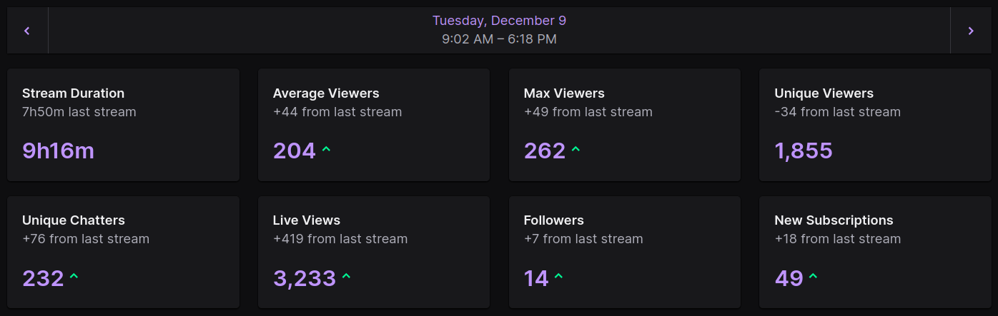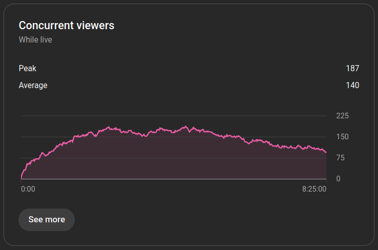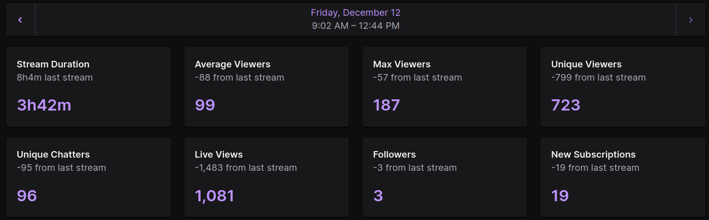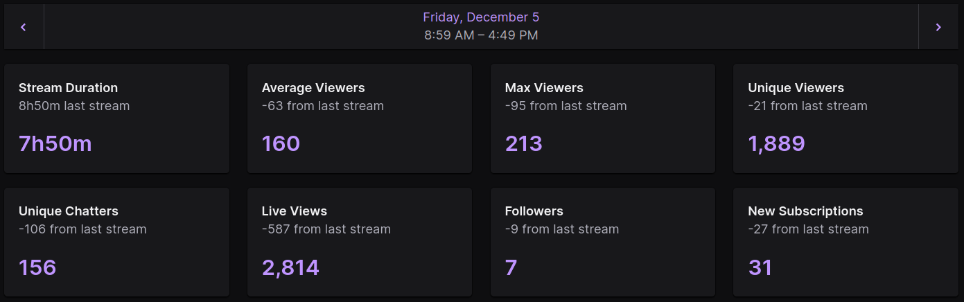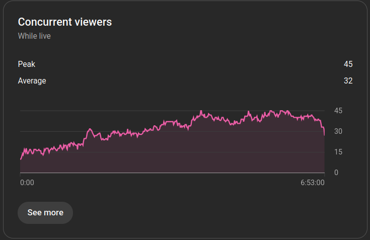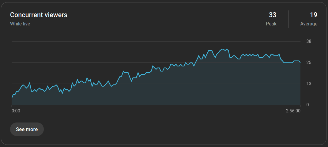 What does this mean? Well, I don't have good stats from this week because as I was streaming today something crappy happened. While I do enjoy messing about in the game it absolutely has some performance issues in spots. Today that manifested by overloading OBS and causing the game to crash. Bringing both of the streams down with it. This breaks the YouTube continuity and requires scheduling a new stream. This also cuts the twitch stats in half. I'll show the average views from the stats I do have.
