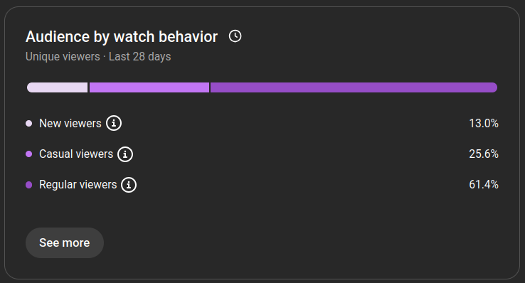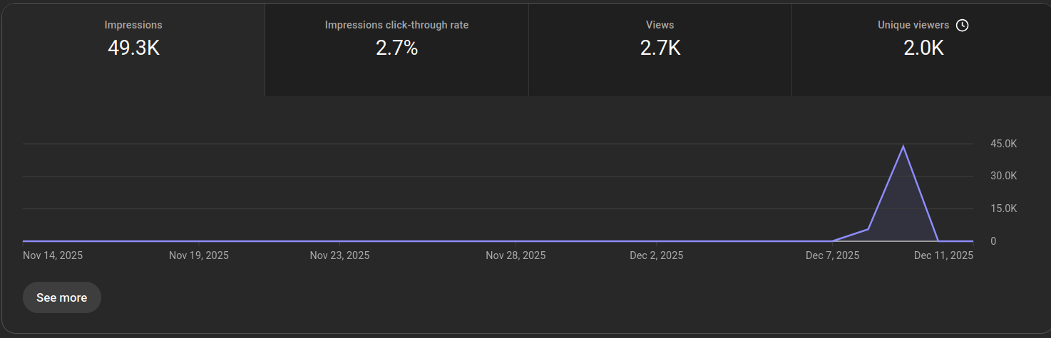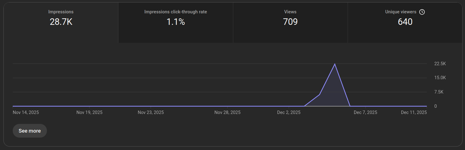 The movies have truly given me long-term stability. My first successful video of this kind was Godlytombs, and since its release my channel’s growth and revenue have tripled. It went from covering groceries and my internet bill to being a third of my monthly income. However, this success has come with one major problem. YouTube has decided that Dwarf Fortress content is all that I am allowed to make. The platform controls how much a video is recommended based on the preferences of the audience watching. This includes live-streaming. What makes this brutal is everything is connected. If your shorts perform well, that sends more eyes to your videos. If your videos perform well that sends traffic to your streams. This becomes a problem if one of the three under performs.