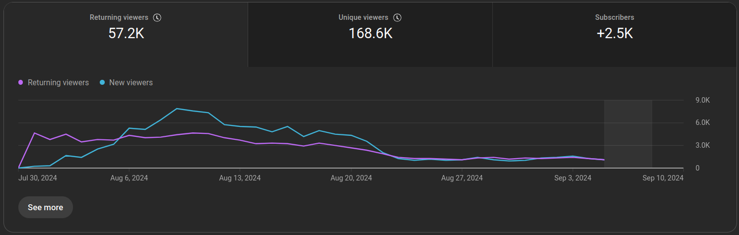 This whole content shift has been a fascinating dive into actually attempting to "game" the YouTube algorithm a bit. Due to the unpredictable nature of how the videos are received by both the audience and YouTube, I can't justify taking much time off after releasing a video. The week leading up to PAX, I streamed for 35 hours, edited for 60 hours, and then streamed for another 20 before leaving for PAX. Then the video achieved 1/5th of the traffic of the one before, which reversed all the momentum I had. To be clear, both videos succeeded in different ways. "Cursed Map, Godlytombs" gained the channel a huge influx of new audience members, while "Cult Video, Goretusk" brought them back for round two. However, the financial and statistical payoff was significantly lower for the hours I put in. I'm both scared and excited as I start working on the next big project. It should take a few weeks, but it will be interesting to see a third result.