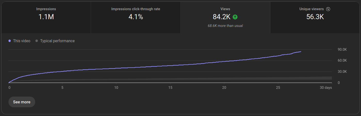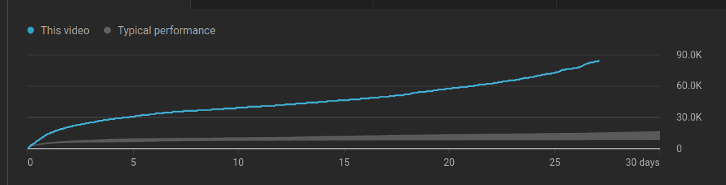 In the first 24 hours the video was out, it gained a whopping 14k views. While that might sound great, out of the three large videos I've released, this is the slowest start one of them has had. I wasn’t too bothered, though, as every video release is different. A week went by, and numbers began to drop a bit, and the video almost completely fell off. These types of videos have a long tail. Frequently, they keep getting recommended due to viewers returning to continue watching, as well as the large volume of comments and interactions they tend to attract. When a video falls off, that’s when the graph below flattens out.