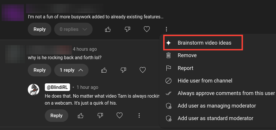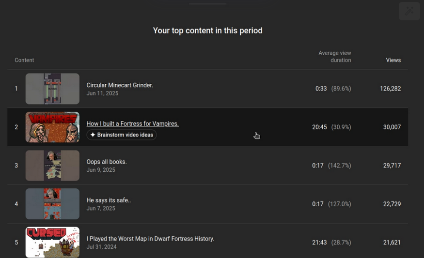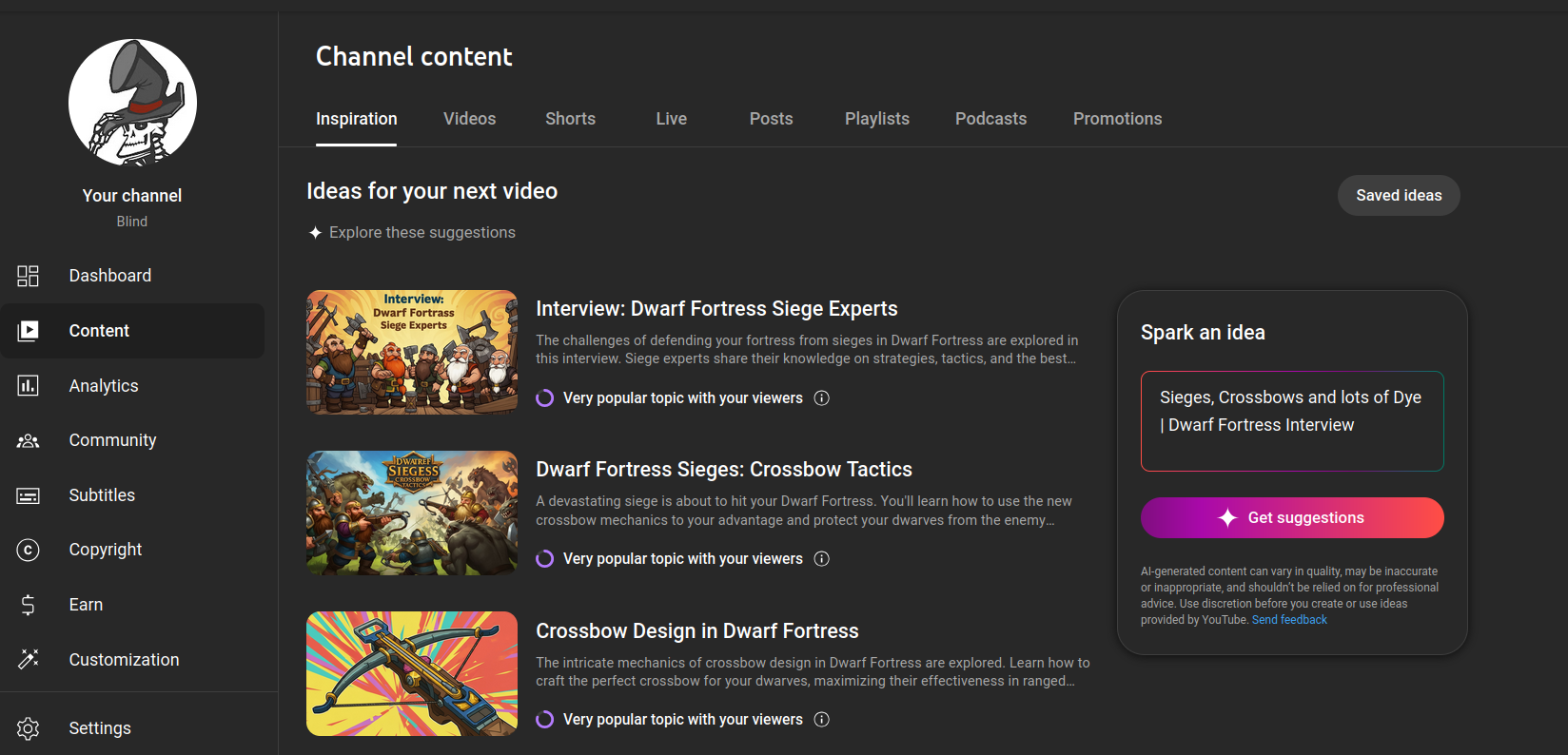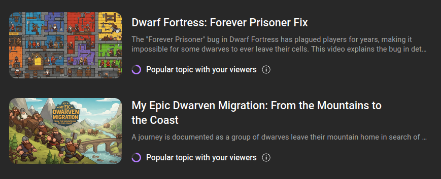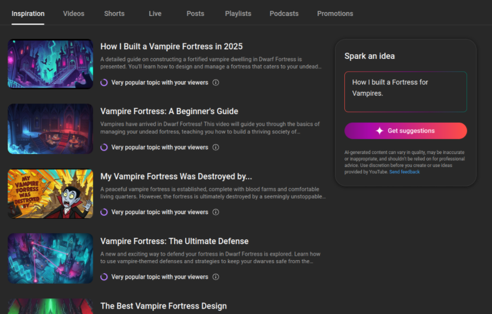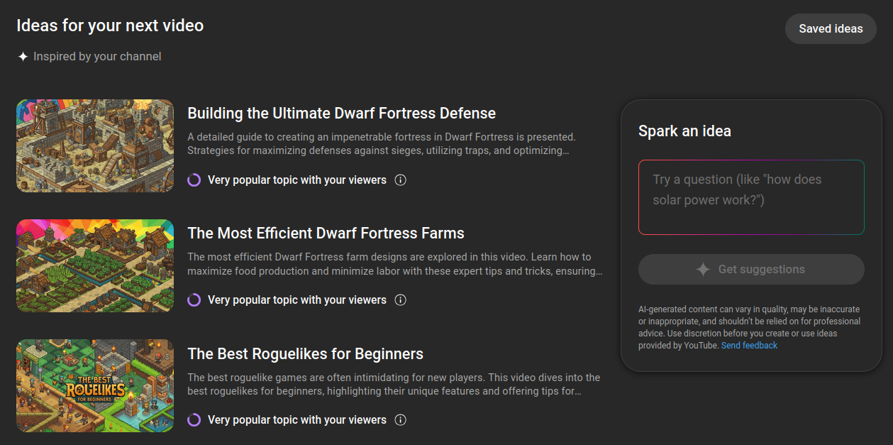 This tab is awful. It is even making up bugs in dwarf fortress that don't exist. I can tell exactly what videos it is taking ideas from. If you have half a brain and basic human creativity most you would have thought of these already. This tab existing on its own is silly but fine. Just a whatever throwaway feature so that execs at YouTube can point and say "See! We have a plan for AI" While in reality all it does in encourage AI slop on the platform.