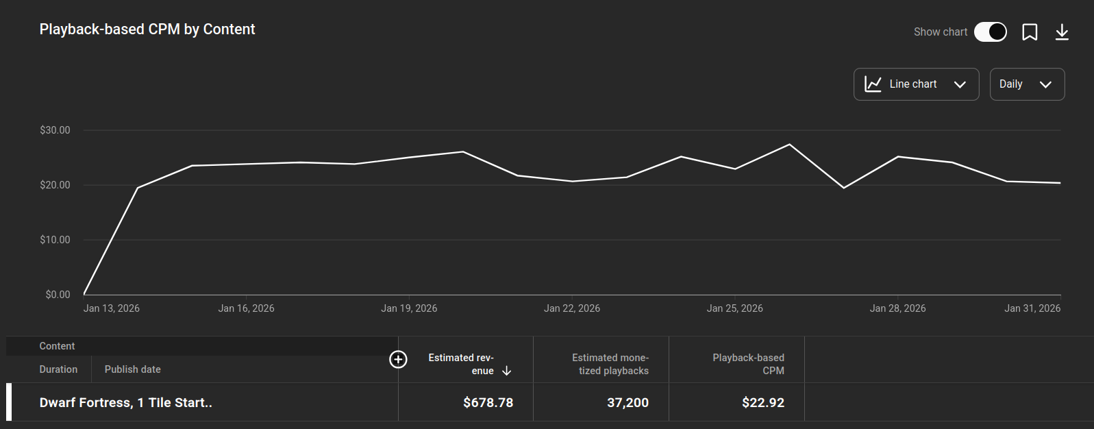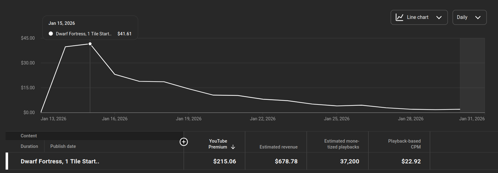 All in, How did my most recent video perform since I uploaded it. It has gained 73k views 25k watch time 185 Subscribers and has made $678.78 ($498.70 usd) cents in Canadian dollars. In parts that equals $463.72 cad in ads and $215.06 in Premium revenue. All the while the advertisers are paying $22.92 average per 1000 views. Not great but not bad for January.