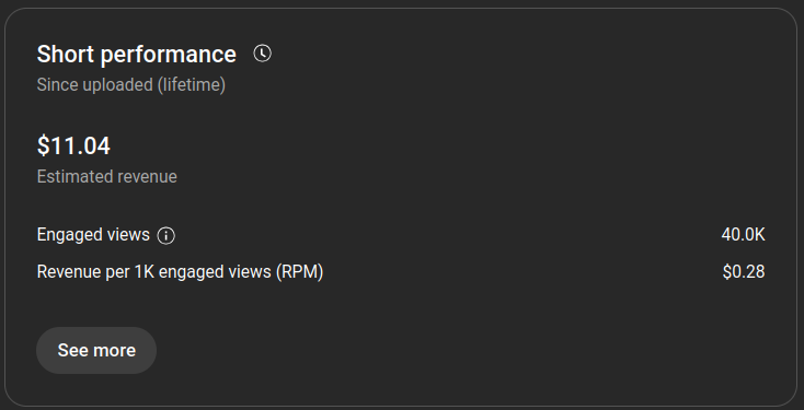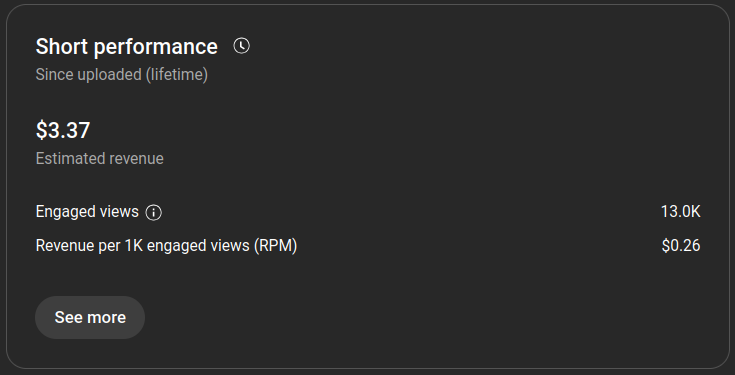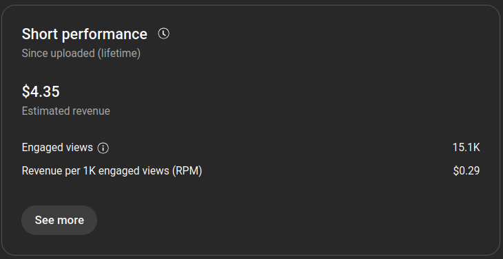 As you can see from the two shorts uploaded after this change. Revenue is still based on the same metric as before. "Engaged views" However because all plays are counted as views the overall number is way higher.